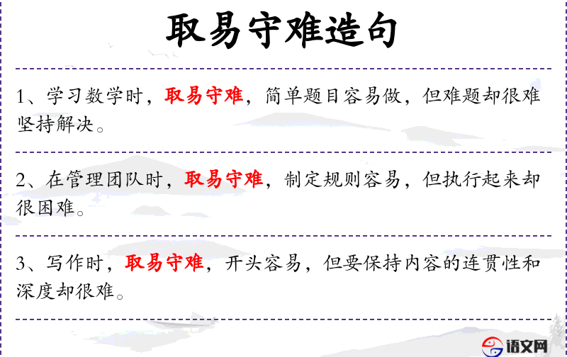 - 谓语:“取易守难”、“容易产生”、“很困难”。
