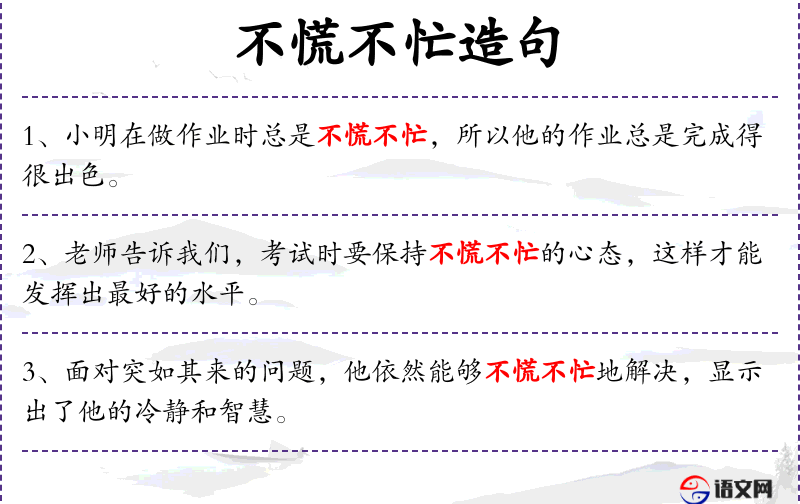 - 不慌不忙:形容词短语,表示镇定、从容。
