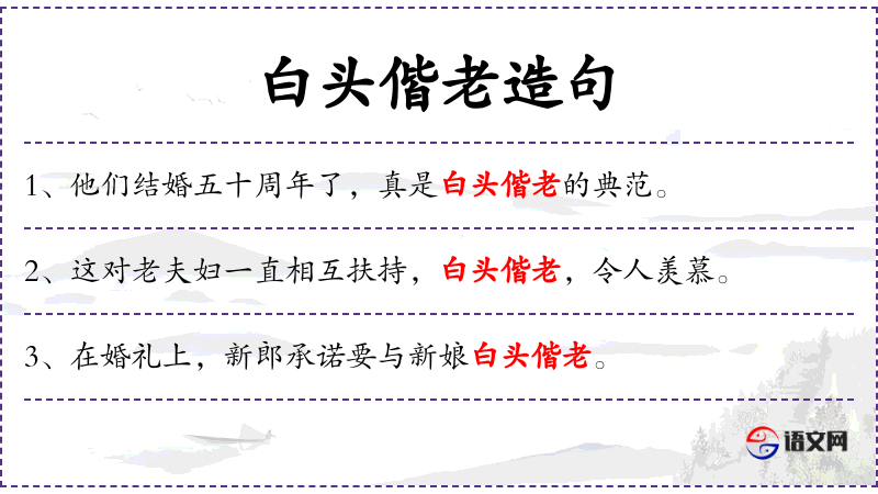 白头:头发白;偕:共同。夫妻相亲相爱,一直到老。