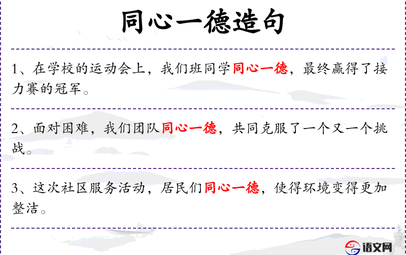 - 同心一德:成语,意思是大家心往一处想,劲往一处使。