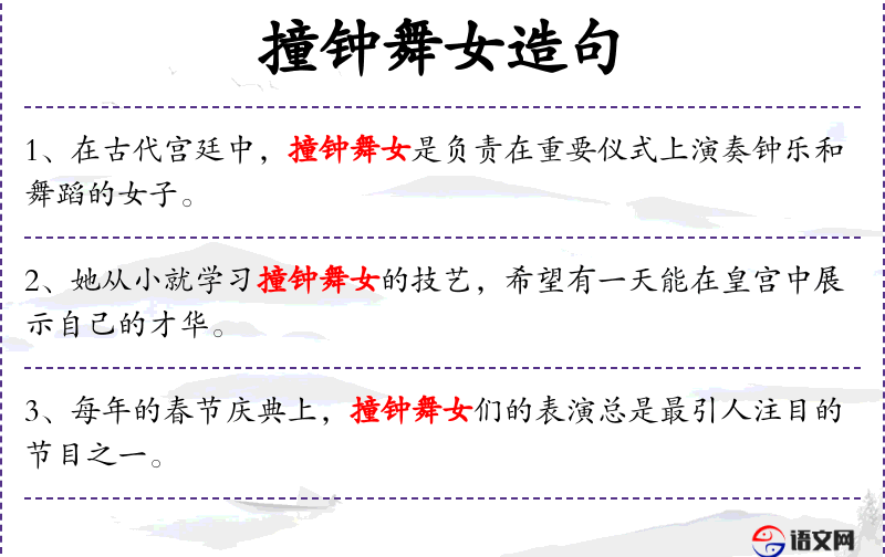 句子可能在讨论古代文化的书籍推荐、学术讨论或文化交流的背景下使用。了解撞钟舞女的历史背景和文化意义,可以增强对句子的理解和应用。