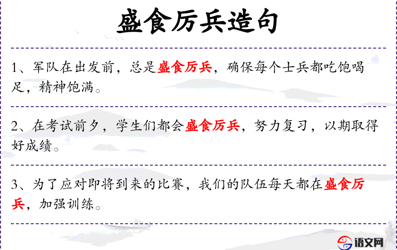 5. 【盛食厉兵】 - 吃饱饭,磨快兵器。比喻做好战斗准备。