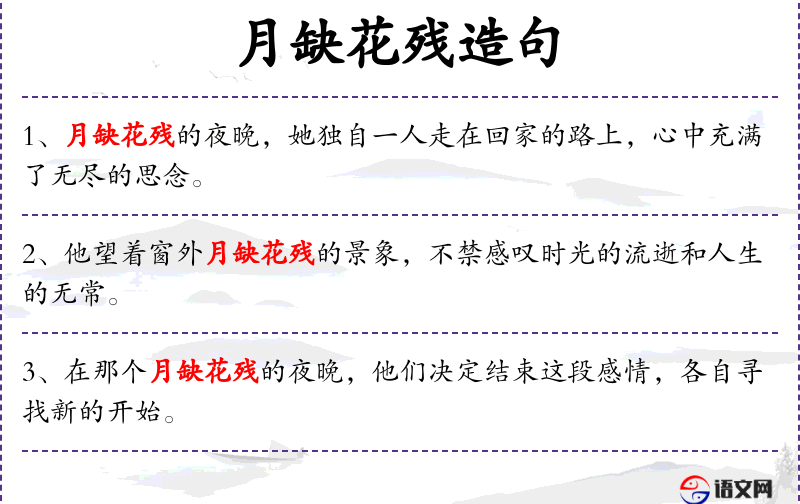 1. 【月缺花残】 - 形容衰败零落的景象。也比喻感情破裂,两相离异。
