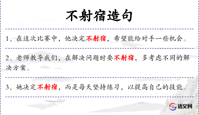 1. 【不射宿】 不射归巢的鸟。言仁者泽及禽兽。