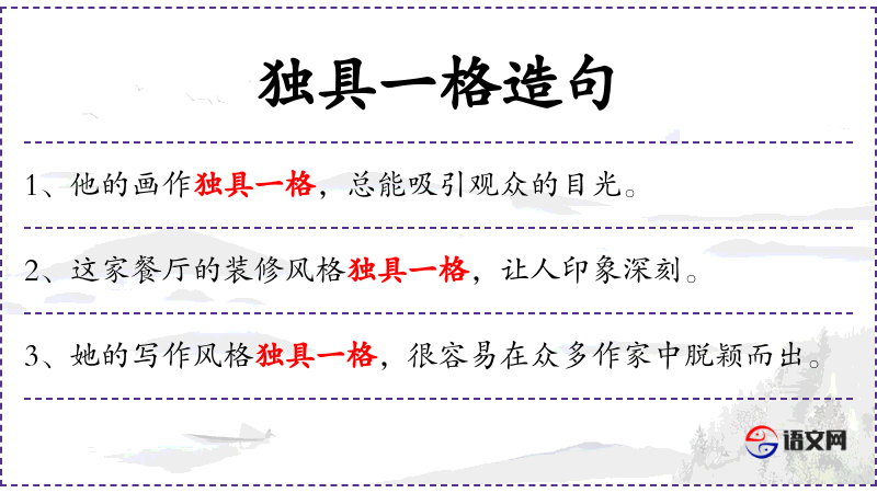 1. 【独具一格】 单独有一种特别的风格、格调。