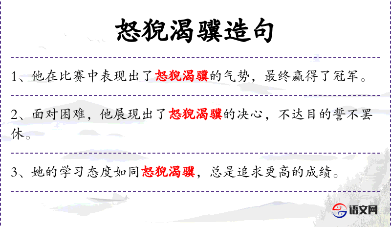 - 宾语:无明显宾语,但“怒狻渴骥”和“全力以赴”都是描述主语状态的动词短语。