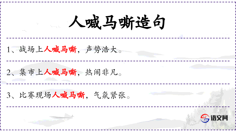 - 谓语:“人喊马嘶”,描述了古代战场上的一种声音现象。