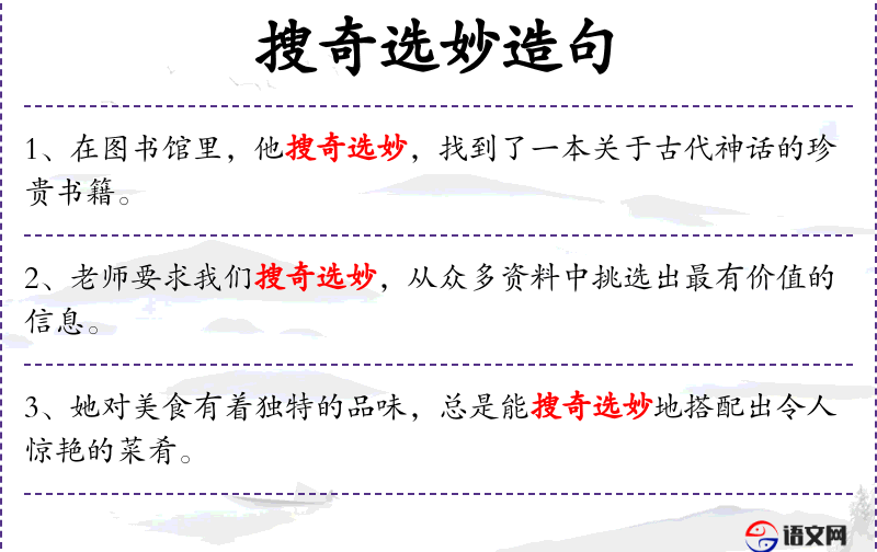 - 搜奇选妙:寻找并选择最奇特、最精妙的事物。