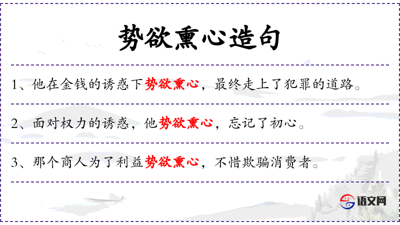 • 势欲熏心:成语,形容人为了达到目的而不择手段,心被欲望所蒙蔽。