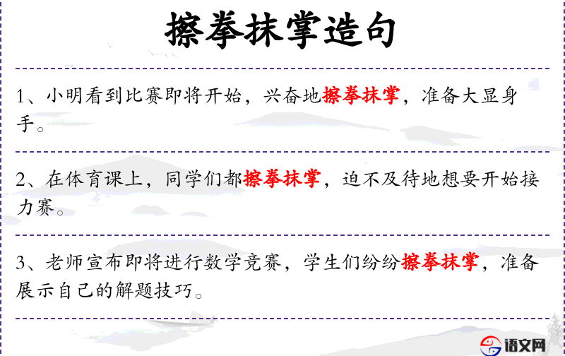 - “擦拳抹掌”是一个成语,源自古代武术准备战斗的动作,现在广泛用于形容准备做某事的样子。