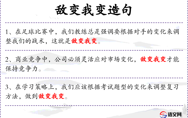 4. 【敌变我变】 敌方情况发生了变化,我方对策也要随之作相应变化。形容机动灵活,随机应变。
