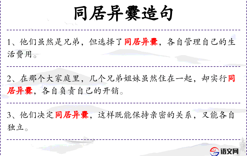 - 同居异爨:指几个人住在一起,但各自做饭,不共享厨房。