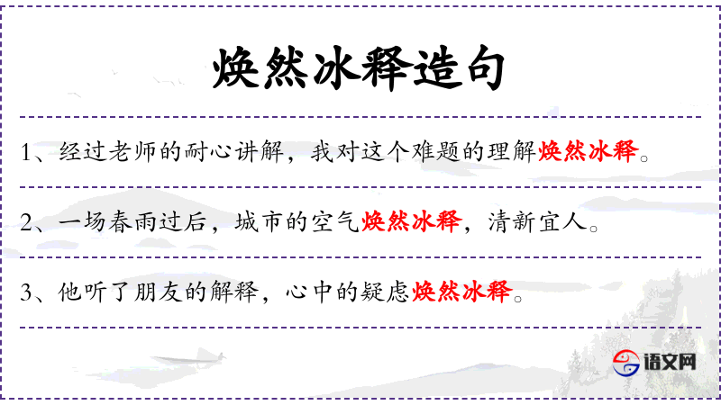 2. 【焕然冰释】 - 焕然:流散的样子;释:消散、解除。指像冰遇热消融一般。多比喻疑虑、误会、隔阂等很快消除。