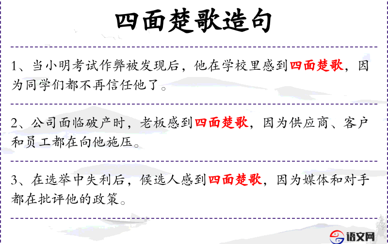 - 在跨文化交流中,理解“四面楚歌”的文化背景有助于更准确地传达句子的含义。