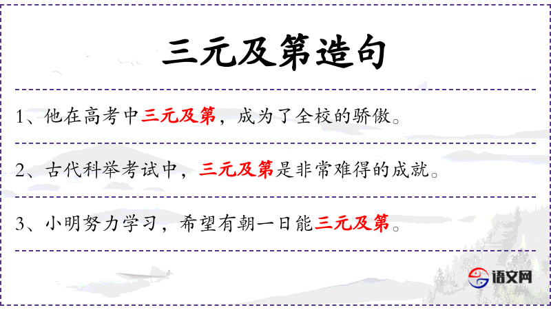1. 【三元及第】 - 三元:科举时代乡试、会试、殿试都是第一名;及第:科举应试中选。从乡试到殿试都考中第一名。
