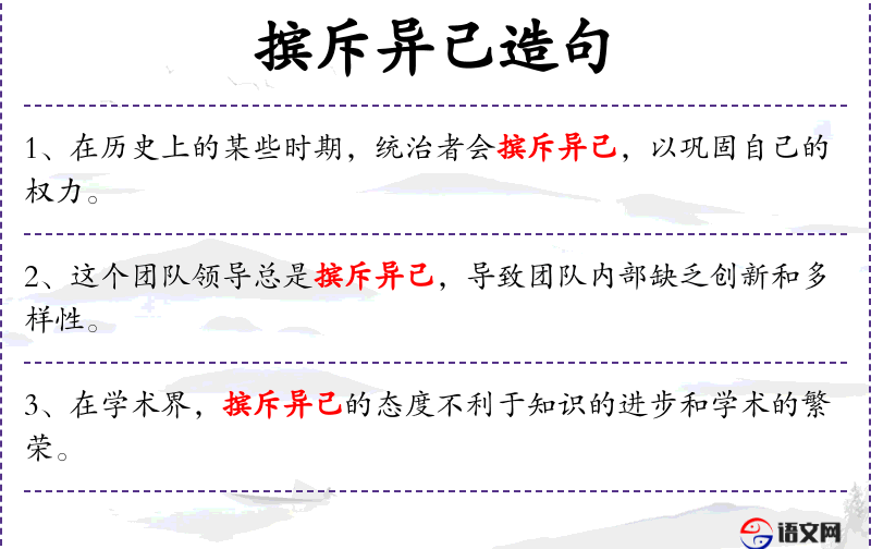 1. 【摈斥异己】 摈斥:排斥;异己:同自己意见不合的人。排挤、清除和自己意见不同或利害冲突的人