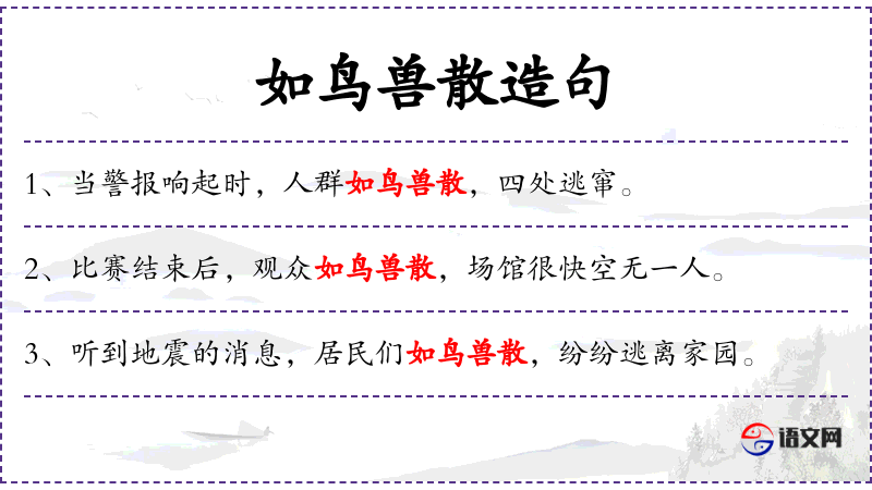 - 如鸟兽散:比喻人群迅速散开,像鸟兽一样。