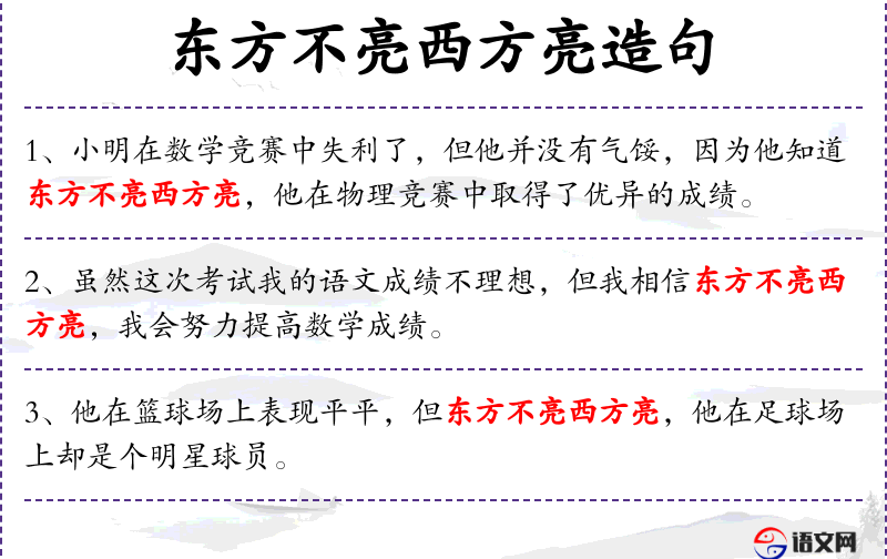 成语“东方不亮西方亮”源自传统文化,反映了人面对困难时的乐观态度和灵活思维。这个成语强调了在逆境中寻找新的出路和机会的重要性。