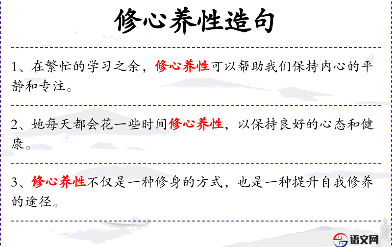 - 修心养性:名词短语,指通过内心的修炼和培养来提升个人品质。