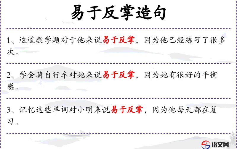 句子在实际交流中可能用于表扬或肯定某人的学*方法或成果。使用“易于反掌”增加了表达的生动性和形象性。