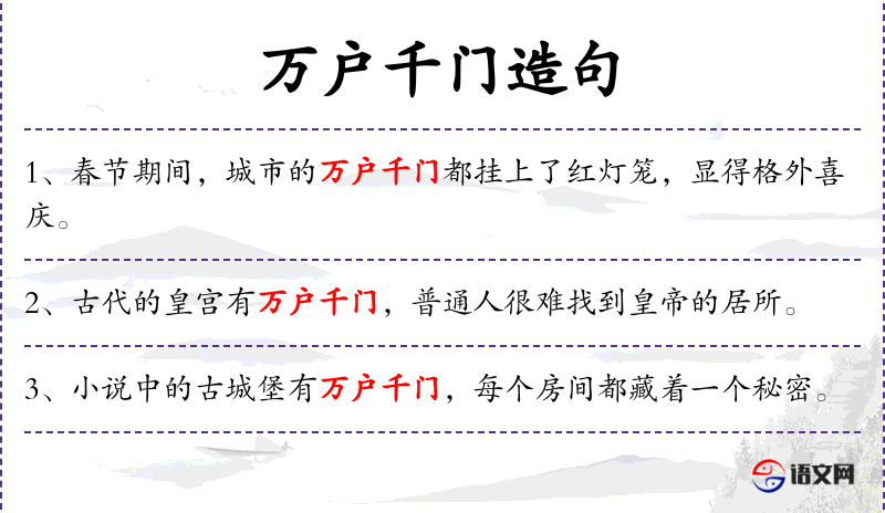 - 相关成语:“万户千门”可能与成语“千门万户”有关,形容宫殿或府邸的宏伟。