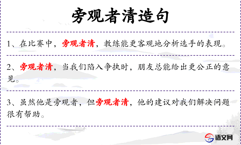 - 旁观者清:成语,意为旁观者因为不直接参与,所以看得更清楚。