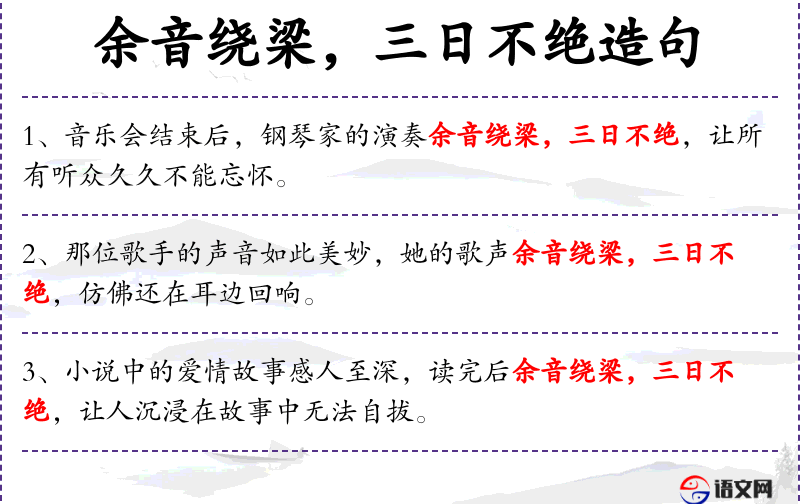 - 余音绕梁:比喻音乐或声音美妙,久久不散。