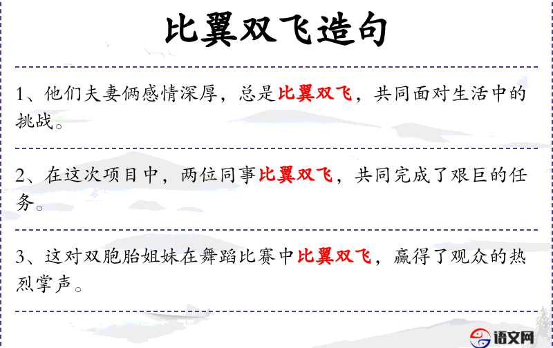 2. 【比翼双飞】 - 比翼:翅膀挨着翅膀。双飞:成双的并飞。比喻夫妻情投意合,在事业上并肩前进。