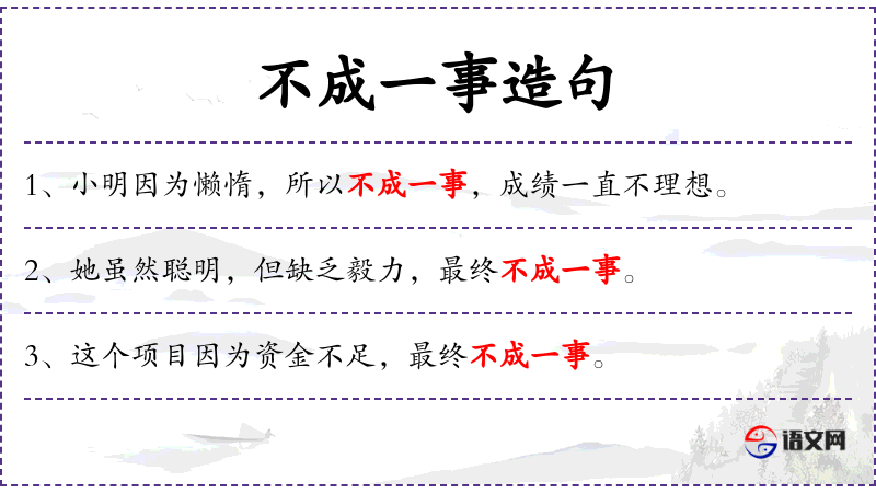 1. 【不成一事】 连一样事情也没有做成。指什么事情都做不成。形容毫无成就。