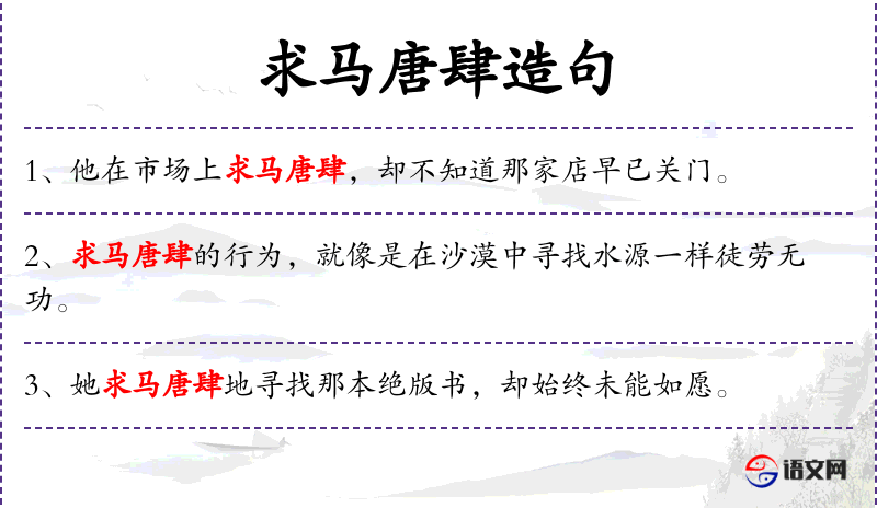 2. 【求马唐肆】 - 唐:原指无壁之屋,引伸为空的;肆:铺子,这里指卖马的地方。到不是停马处去找马。比喻在什么也没有的地方寻求自己所需的东西。