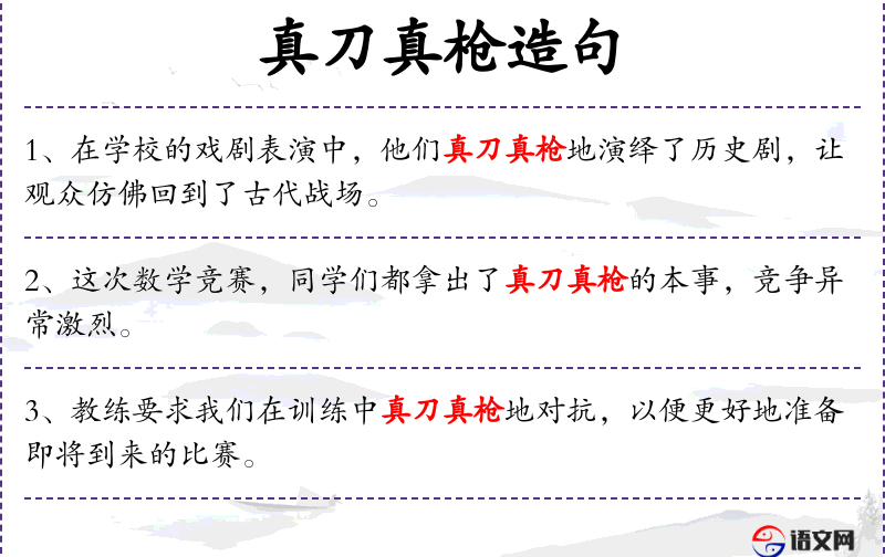 5. 【真刀真枪】 ①真实的刀枪。②比喻毫不作假,实实在在