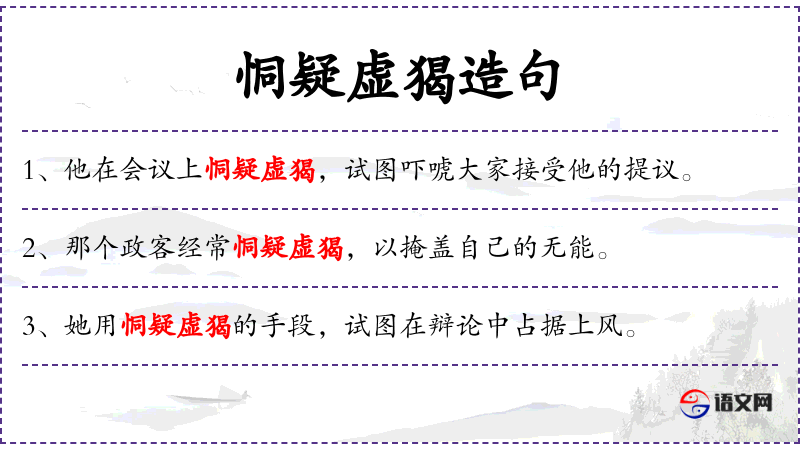 - 恫疑虚猲:这是一个成语,意为虚张声势,用以吓唬人。可以扩展学*相关的成语,如“虚张声势”、“装腔作势”等。