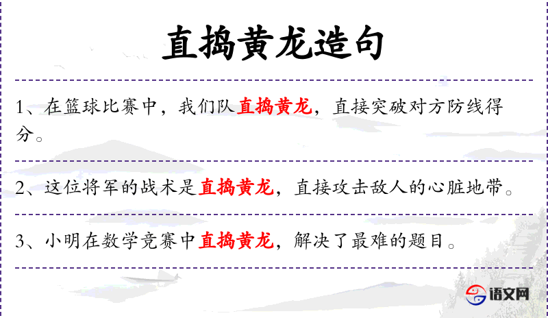 1. 【直捣黄龙】 - 黄龙:即黄龙府,辖地在今吉林一带,为金人的腹了。一直打到黄龙府。指捣毁敌人的巢穴。