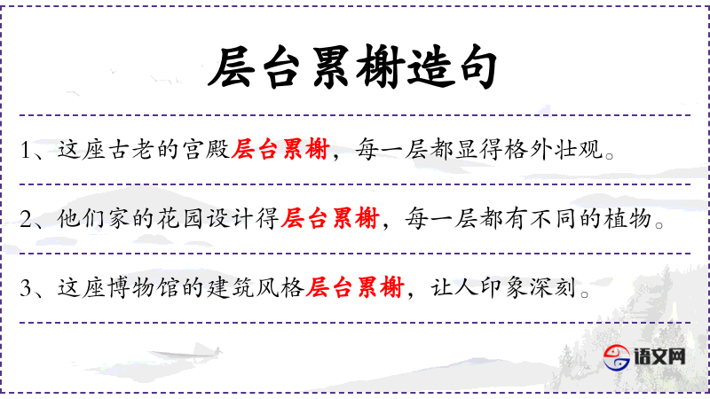 - 宾语:无明确宾语,但“层台累榭”描述了布置的效果