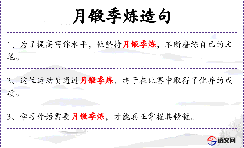 2. 【月锻季炼】 - 锻、炼:加工锤炼。形容长时间地加工修改。