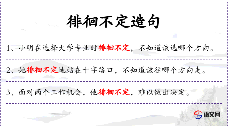 - 徘徊不定:形容词短语,表示犹豫不决,无法做出决定。