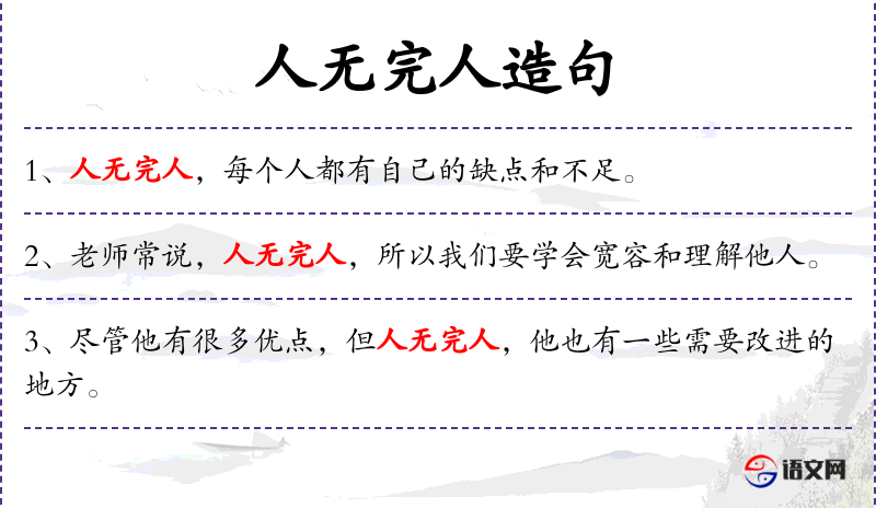- 成语、典故:“人无完人”是一个常用的成语,源自**传统文化。