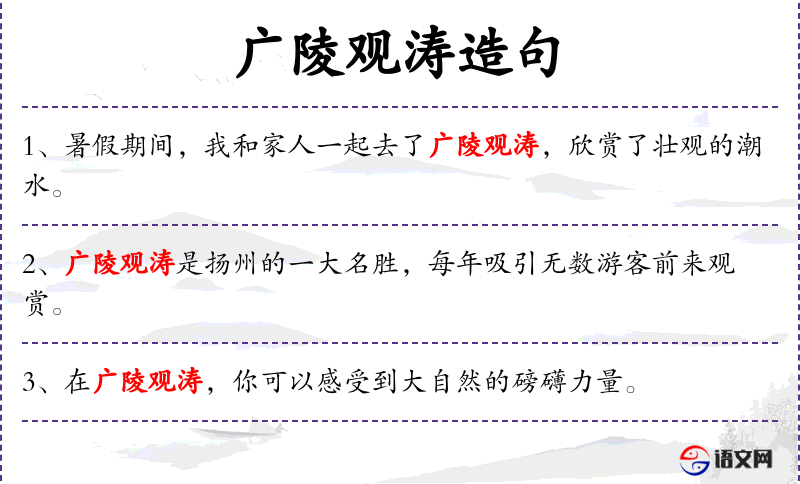 - 宾语:“广陵观涛”是句子的宾语,指明了动作的目的地或对象。
