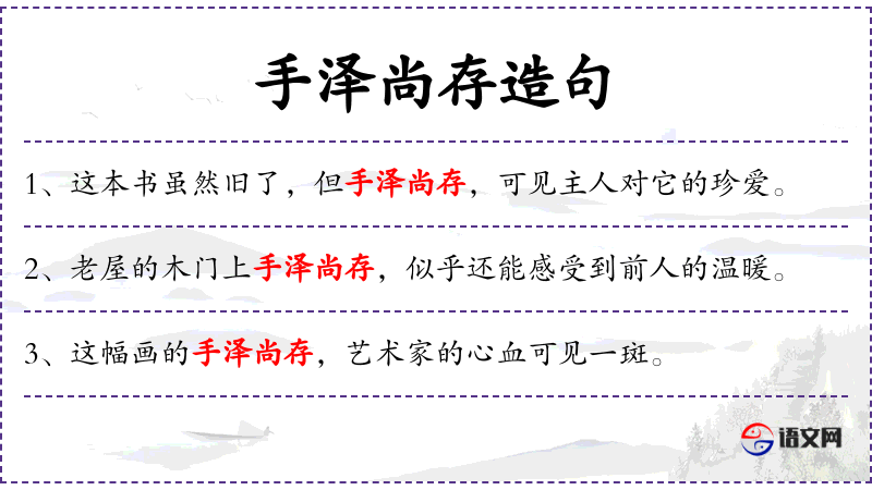 1. 【手泽尚存】 手泽:为手汗所沾润。指先人遗物仍然保存着。多指著述、手迹。