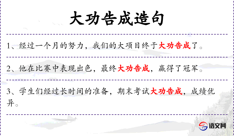 - 文化意义:在**文化中,“大功告成”是一个常用的成语,用来庆祝重大成就的完成。