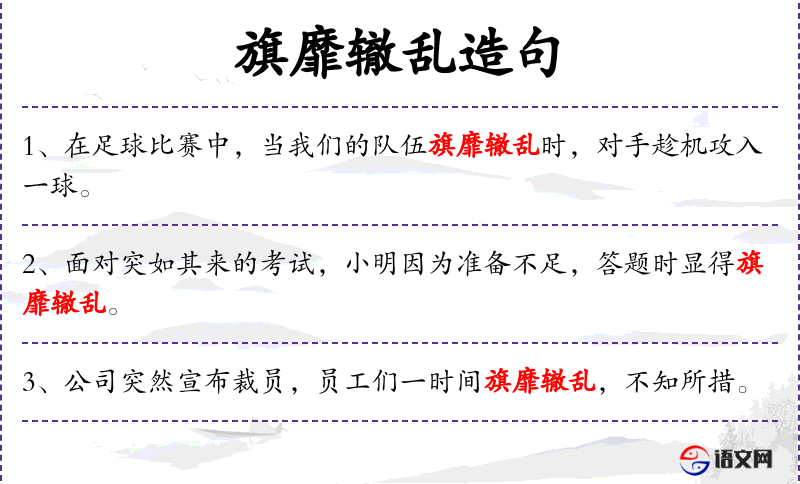 - 旗靡辙乱:成语,形容动作不协调、混乱。