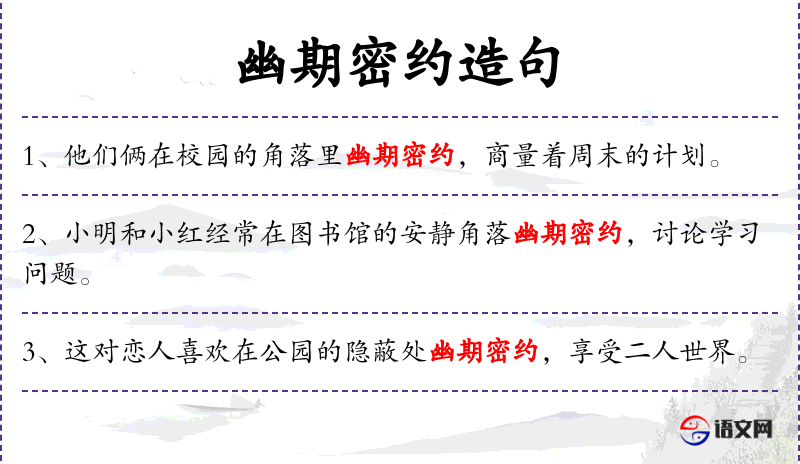 “幽期密约”这个成语源自**古代文学,常用来描述恋人间的私密会面。在现代语境中,这个词组仍然保留了其浪漫和私密的意味。