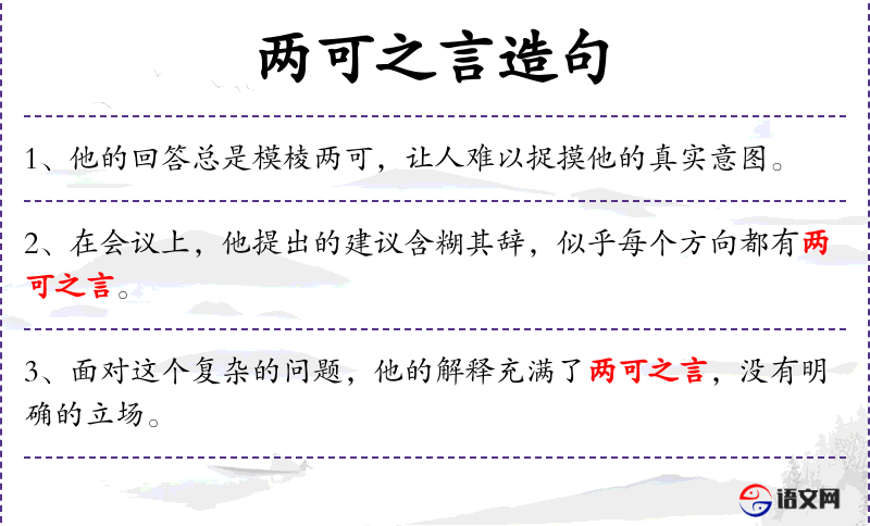 - 成语:“模棱两可”、“含糊其辞”