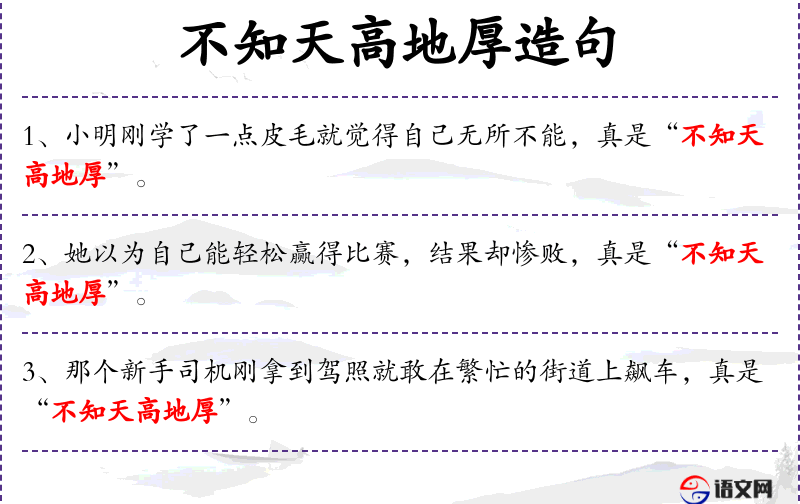 1. 【不知天高地厚】 不知道天有多高,地有多深。形容骄狂无知。