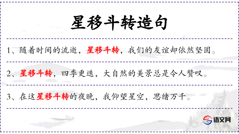 - 星移斗转:指天体的位置发生变化,比喻时间的流逝或事物的变迁。
