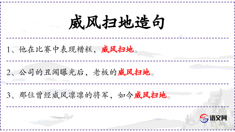 - “威风扫地”:成语,意指威严和气势完全丧失。