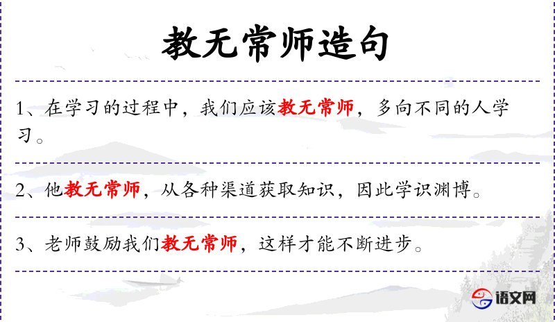- 教无常师:名词短语,表示教育或学*不应局限于特定的老师或方法。