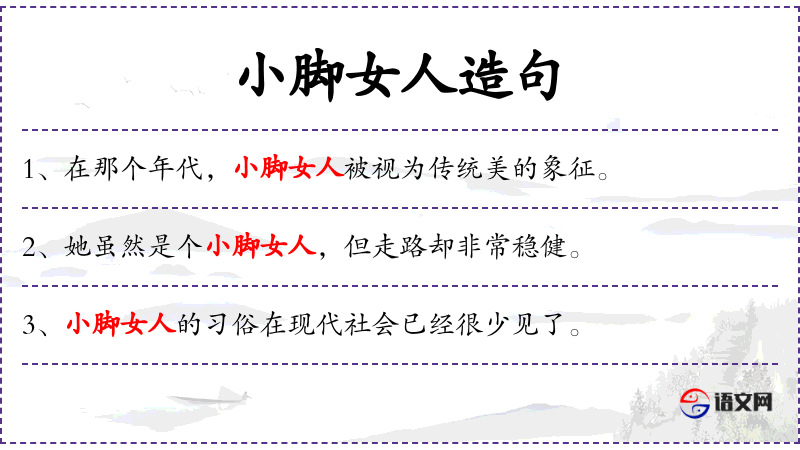 - 小脚女人:指历史上*妇女因缠足俗而形成的小脚。