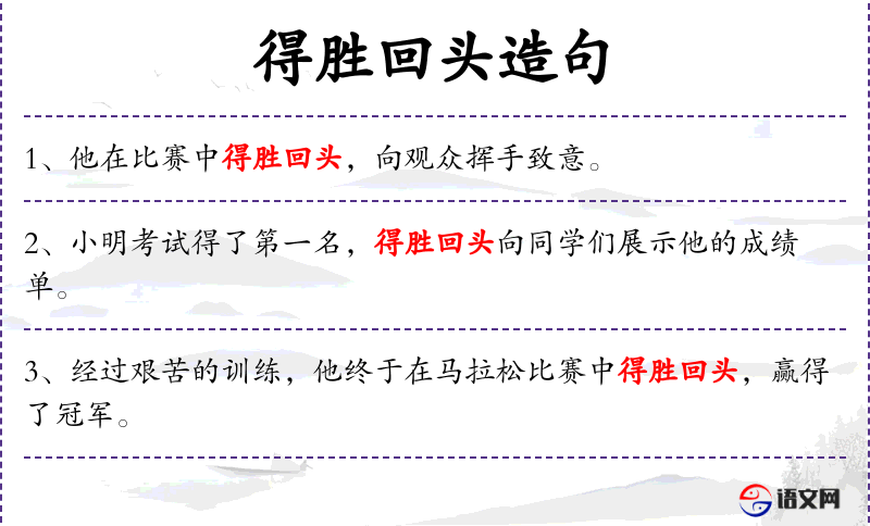 - 得胜:动词,表示获胜或取得胜利。 *. 回头:副词,表示转向或返回。