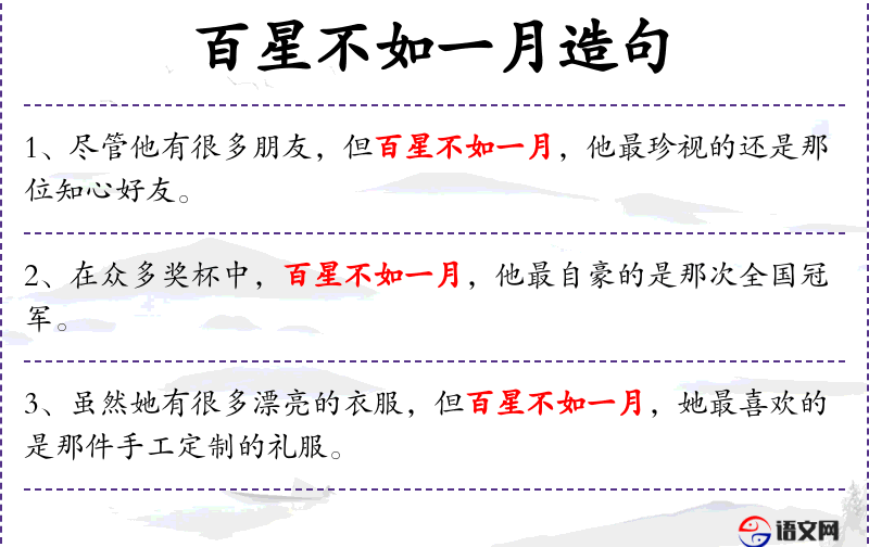 2. 【百星不如一月】 - 一百颗星星发出的亮光不如一个月亮发出的光明亮。比喻量多不如质优。